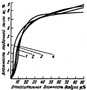 | Влажность пыли отличается от влажности листового и резаного табака. На основании исследований построены изотермы сорбции для образцов пыли (рис. 3). При изменении относительной влажности воздуха от 50% до 75% влажность табачной пыли изменяется от 7,5% до 8,5%. ПДК табачной пыли в воздухе рабочей зоны — 3 мг/м3 . Другими вредными выделениями табачного производства являются избыточная конвективная и лучистая теплота, влага, а также метиловый спирт и бумажная пыль. |