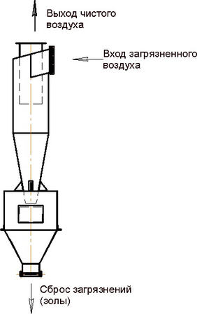 Запыленный газ по воздуховоду подается в цилиндрическую часть циклона где за счет тангенциального ввода приобретает вихревое движение. Частицы пыли под действием центробежной силы отбрасывается к стенкам циклона и ссыпаются по конической его части к разгрузочному отверстию. Обеспыленный воздух отводится из циклона через верхний патрубок.
