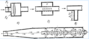 а – камерный; б – резонансный; в – четвертьволновой; е – глушитель шума выпуска мотоциклетного двигателя