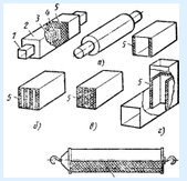 Глушители вентиляционных установок. Наибольшее распространение в вентиляторных установках общепромышленного назначения получили глушителя абсорбционного типа — трубчатые, пластинчатые, цилиндрические, облицованные изнутри ЗПМ повороты воздуховодов (рисунок 8), поскольку вентиляторы имеют широкополосный спектр шума. Конструкции глушителей подбирают в зависимости от поперечных размеров воздуховода, допустимой скорости воздушного потока, требуемого снижения УЗД и места для установки глушителя.