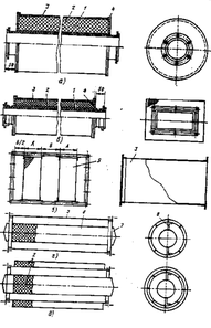 г – цилиндрический; 3 – цилиндрический комбинированный; 1 – перфорированная обечайка; 2 – звукопоглощающий холст; 1 – короб наружный; 4 – диафрагма;