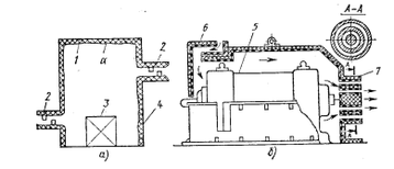 На машиностроительных предприятиям повышенный шум на рабочих местах и в жилой застройке часто создается при работе вентиляторных, компрессорных и газотурбинных установок, систем сброса сжатого воздуха, стендов для испытаний различных двигателей. Снижение шума аэродинамического происхождения достигается установкой глушителей в каналах и воздуховодах на пути распространения шума от его источника до места всасывания или выброса воздуха и газов. Глушители подразделяются на абсорбционные, реактивные (рефлексные) и комбинированные. Снижение шума в абсорбционных глушителях происходит за счет поглощения звуковой анергии применяемыми в них звукопоглощающими материалами и конструкциями, а в реактивных – в результате отражения звука обратно к источнику. Комбинированные глушителя обладают свойством как поглощать, так и отражать звук. Выбор типа глушителя зависит от конструкции заглушаемой установки (стенда, системы и т.д.), спектра и требуемого снижения шума. Применение глушителей для различных установок и систем рассмотрено ниже.