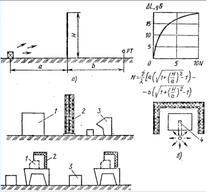Уменьшение шума на пути его распространения применяют, когда перечисленные выше методы не обеспечивают требуемого снижения шума. Снижение шума достигается за счет уменьшения интенсивности прямого шума lпр путем установки звукоизолирующих перегородок, кожухов, экранов (рисунок 3) и т.п. Сущность звукоизоляции ограждения состоит в том, что падающая на него энергия звуковой волны отражается в значительно большей степени, чем проходит за ограждение. Звукоизолирующая способность (дБ) перегородки выражается величиной: