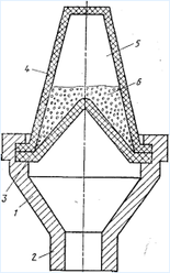 1 — корпус; 2 — штуцер; 3 и 4 — пористые перегородки; 5 — замкнутая полость;