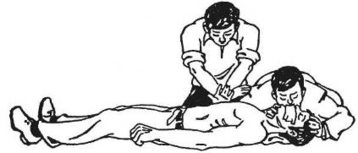 Рис. 10. Проведення штучного дихання та зовнішнього масажу серця двома особами