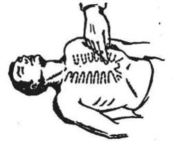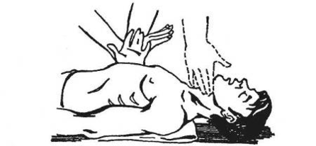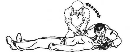 Непрямий масаж серця і штучне дихання зазвичай може робити й одна людина (рис. 6). У такому разі після кожного вдування повітря в рот або в ніс натискають чотири рази на грудину.