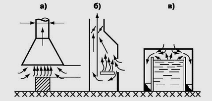 Рис.1 Воздухопринемные устройства местных вытяжных систем: вытяжной зонт (а); вытяжной шкаф (б); бортовой отсос (в).