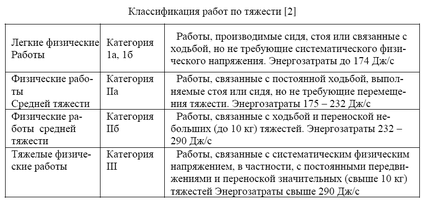 2) категория работы; категории работ разграничиваются на основе интенсивности энерготрат организма в ккал/ч (Вт)(табл.1)
