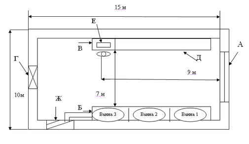 А – окно; Б – отсек с ваннами; В – компьютерный стол; Г – выход из лаборатории; Д – установка для вибродиагностики; Е – компьютер; Ж – вентиляция.