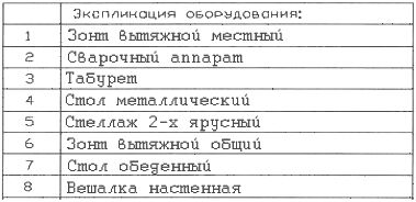Сварочный цех представляет собой прямоугольное помещение площадью 54 м2 с тремя сварочными кабинами, в каждой из которых находится специальный стол, табурет, сварочный преобразователь, электрододержатель, горелка. Преобразователь состоит из генератора постоянного тока и электродвигателя. Он соединен с электрододержателем посредством сварочных проводов (преобразователь является источником повышенного напряжения, электромагнитного поля, ультразвука.) Вентиляция осуществляется с помощью вытяжных зонтов, трех местных и одного общего. Во входной части цеха располагаются вешалки и обеденный стол.