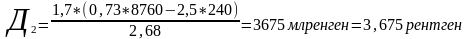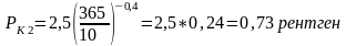 де РП2, РК2 - piвні радіації на початку /tП/ і в кінці /tК/ середньої фази аварії, tП = 10 діб; tК = 355+10 діб /час у формулу підставляють в годинах/.