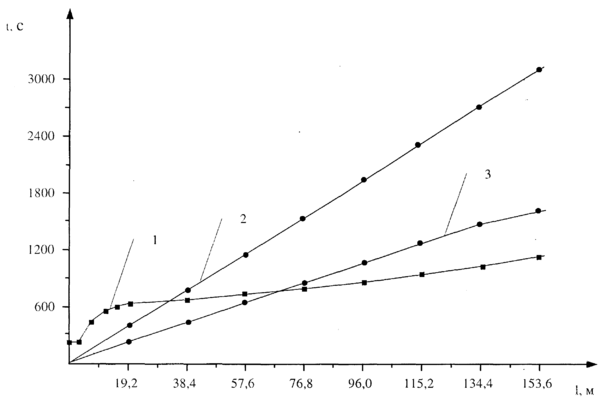 На рис. 8 представлены экспериментальные зависимости времени достижения критических значений температур по длине аварийного вагона на путях эвакуации в тоннеле, полученные при сжигании вагона метрополитена в натурном макете перегонного тоннеля.