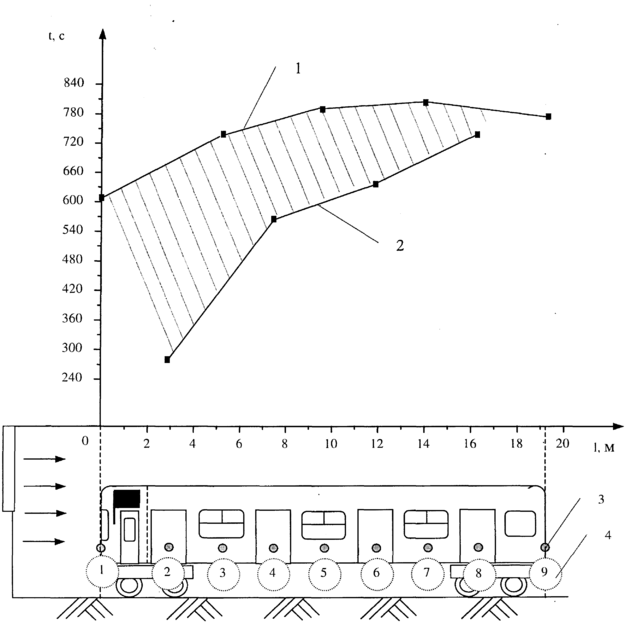 1 - температура на стыке аварийного (вагон 1) и смежного (вагон 2) с ним вагона;