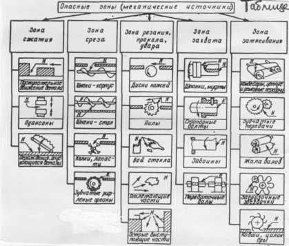 Применительно к текстильным машинам выявлено в качестве опасных зон источников пять основных групп: механические, термические, давления, электрические и химические. 1. Зоны механических источников подразделяются в свою очередь на пять подгрупп, перечисленных ниже: