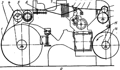 Нити основы 2, сматываясь с навоя 1, огибают подвижное скало 4, проходят над подскальной трубой 5, через ламели основонаблюдателя 6, галева ремизок 7, зубья берда 8 и между зубьями направляющей гребенки батана 9. Благодаря подъему и опусканию ремизок нити основы образуют зев, в который малогабаритными прокладчиками утка вводится уточная нить. Проложенная нить прибивается к опушке ткани бердом 8. Образованная ткань 11, пройдя шпарутки и опору 10 ткани, огибает грудницу 12, вальян 14, прижимной валик 13 и отжимной валик 15 и наматывается на товарный валик 16.