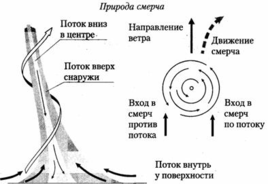 Торнадо – так называют смерчи в Америке (только сухопутный смерч), в Западной и Южной Европе он зовется тромбом. В России – смерч. Русское слово "смерч" происходит от слова "сумрак", поскольку смерчи появляются из чёрных грозовых облаков, застилающих небо... Все это вихри с вертикальной осью вращения (скорость вращения300-500 м/ч), образующиеся в нижних слоях атмосферы при неустойчивом ее состоянии, когда воздух в верхних слоях очень холодный, а в нижних тёплый. Происходит интенсивный воздухообмен, сопровождаемый образованием вихря огромной силы. Возникают смерчи в мощных грозовых облаках и часто сопровождаются грозой, дождём, градом (размеры отдельных градин в окружности иногда доходят до 45 см), нельзя сказать, что смерчи возникают в каждом грозовом облаке. Как правило, это происходит на гране фронтов - в переходной зоне между тёплой и холодной воздушными массами. Существуют они не долго: от нескольких секунд до нескольких часов, так как довольно скоро холодная и тёплая воздушные массы перемешиваются, и таким образом поддерживающая его причина исчезает; движется же с довольно большой скоростью по прямой или зигзагообразной траектории. Смерч представляет собой огромный пустотелый цилиндр, ярко освещенный внутри блеском молний. Изнутри раздается оглушительный рев и жужжание; воронка смерча представляет собой вращающийся поток дождя и града, свернутый в спираль в виде относительно тонкой стенки. Содержание воды в стенках воронки должно по массе во много раз превосходить содержание там воздуха. Если плотность сухого воздуха составляет 1,3-1,4 кг/м3, то плотность воздуха, содержащего воду и лед внутри стенок смерча, может составлять > 50 кг/м3.