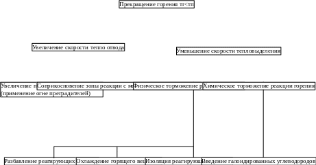 Каждому тепловому равновесию соответствует определённая температура горения Тг, которая иначе называется температурой теплового равновесия. При этом состоянии скорость тепловыделения равна скорости теплоотдачи. Данная температура не является постоянной, она изменяется с изменением скоростей тепловыделения и теплоотдачи. Исходя из этого, основными условиями прекращения горения являются снижение скорости тепловыделения и увеличение скорости теплоотвода от зоны горения, то есть добиться действиями такого понижения температуры в зоне реакции, при которой горение прекратится. Абсолютный предел такой температуры называется температурой потухания. В процессе тушения пожара условия потухания создаются: