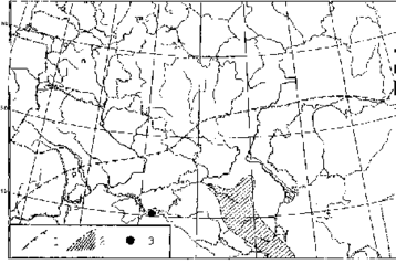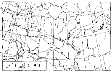 Рис. 1. Гнездовой ареал розового скворца в Восточной Европе по данным Е.П. Спангенберга (1954) и в настоящее время (Костин, 1983; Белик, 1993 и др.): 1 — северная граница ареала в первой половине XX в.; 2 — предельная граница пульсации ареала в 1980-е гг.; 3 — место постоянного гнездования в Крыму.
