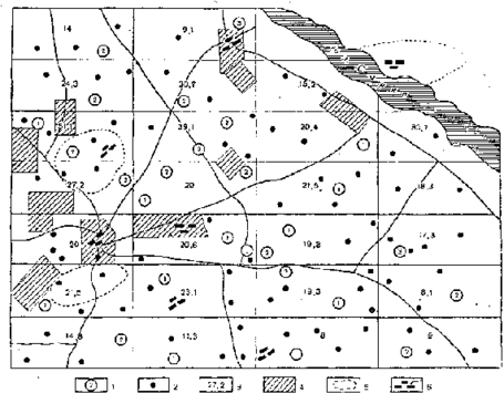 Рис. 4. Распределение жилых и брошенных гнезд степного орла в 1956 г. на Сарпинской низменности на участке 35 х 50 км, на следующий год после уничтожения сусликов фосфидом цинка (по: Семенов и др., 1959): 1 — жилые гнезда и количество яиц в кладках, 2 — брошенные гнезда, 3 — обилие сусликов в особях/га в среднем по отдельным клеткам, 4 — распаханные земли, 5 — районы скоплений холостых степных орлов, 6 — посёлки и дороги.