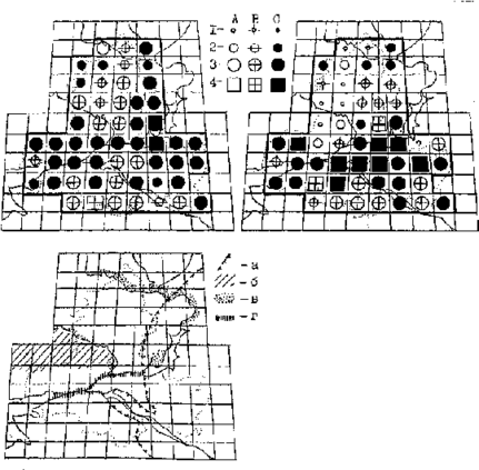 Рис. 2. Растровые карты ареалов обыкновенной пустельги (слева), кобчика (справа) и распределение их основных кормовых стаций (внизу) в Ростовской области в конце 1970-х — начале 1990-х гг. (система квадратов UTM 50 х 50 км). Плотность (пар/кв.): 1 — 1–10, 2 — 10–100, 3 — 100–1000, 4 — 1000–10000; гнездование: А — возможно, В — вероятно, С — доказано; а — западная граница сухих степей, б — каменистые степи, в — песчаные степи, г — пойменные луга.