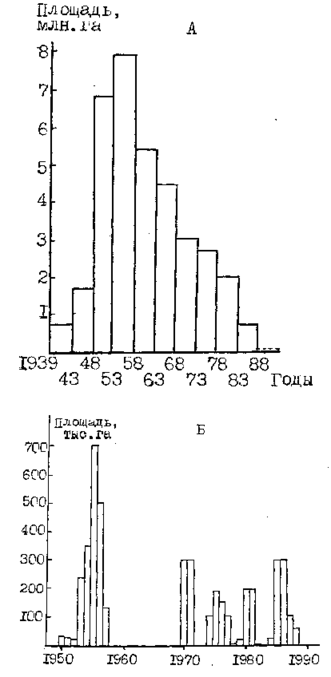 Рис. 5. Динамика дератизационных обработок зерновыми приманками с фосфидом цинка в Западном Казахстане: А — обработки Волго-Уральских песков против мелких песчанок по пятилетиям за 1939–1990 гг. (по данным Гурьевской противочумной станции); Б — обработки полупустынь Уральской области против сусликов в 1952–1988 гг. (по данным В.Л. Шевченко, личн. сообщ.).