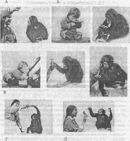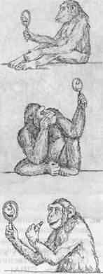 В возрасте 4,5—5 лет многие шимпанзе, гориллы и орангутаны явно могут узнавать себя в зеркале, осознавать свое отличие от окружающих и пользоваться зеркалом во многом так, как это делают люди. Одновременно у них развивается и способность подражать ранее им незнакомым произвольным действиям. Например, шимпанзе Вики, воспитанная американскими психологами супругами Хейс, уже в двухлетнем возрасте, стоя перед зеркалом, мазала помадой губы (рис. 2), повторяя все движения, которые обычно делала ее хозяйка. Впоследствии она копировала более 55 поз и гримас, показанных ей на фотографиях, причем некоторые из них она никогда ранее не видела.