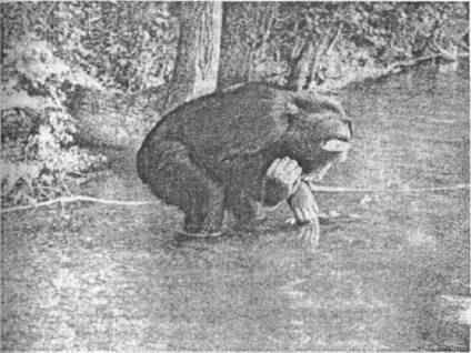 По наблюдениям другого знатока поведения обезьян в природе — Дж. Гудолл (1992), многие дикие шимпанзе, в отличие от этой гориллы, при виде своего отражения в зеркале проявляют агрессию. Следует учесть, что возможность видеть свое отражение у живущих на воле обезьян крайне ограниченна. Известно, что шимпанзе не любят воды, а единственный способ видеть свое отражение в природных условиях — наклониться над водной поверхностью. Приведенная на рис. 4 фотография подростка шимпанзе, который играет на мелководье, зафиксировала довольно редкий эпизод.