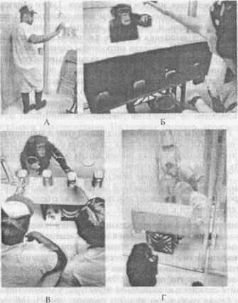 Рис. 5. Существует ли у шимпанзе связь между тем, что они видят, и тем, что известно (или неизвестно) другим? Пояснения в тексте. Фотография любезно предоставлена доктором Д. Повинелли (Йельс-кий университет, Коннектикут, США).