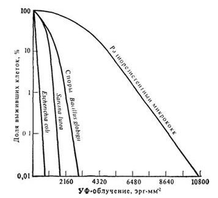 Исключительная резистентность М. radiodurans вызывает особый интерес, исследование кривых выживания выявило очень длинное плечо, выходящее за пределы 1,5 мрад. Этот организм обладает наивысшей резистентностью к гамма-излучению по сравнению со всеми изученными до сих пор микроорганизмами. Для него характерна также необычайная резистентность к УФ-излучению, превышающая резистентность всех исследованных в этом отношении бактерий. Кривая выживания при УФ-облучении состоит из трех компонентов: очень длинного плеча, доходящего до 9000 эрг-мм-2, экспоненциальной части и выраженного «хвоста», который начинается при 25 000 эрг-мм-2 и тянется значительно дальше 50 000 эрг-мм-2. Наличие большого плеча указывает на существование исключительно эффективной клеточной системы репарации.