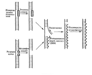 Действие разнообразных инактивирующих агентов на клетки может приводить к возникновению в ДНК целого ряда различных повреждений. Детальное изучение системы эксцизионной репарации стало возможным благодаря наличию радиационно-чувствительных мутантов, с помощью которых удалось выделить и охарактеризовать специфические ферменты, принимающие участие в разных стадиях этого процесса. У Е. coli имеется, по крайней мере, четыре таких этапа. На первом этапе происходит разрыв цепи ДНК вблизи повреждения под действием эндонуклеазы, узнающей нарушения структуры ДНК. Такая УФ-специфическая эндонуклеаза была выделена из Micrococcus luteus и Е. coli. За разрывом цепи ДНК следует удаление пиримидиновых димеров, осуществляемое экзонуклеазой. Удаление димеров сопровождается дополнительной деградацией ДНК с образованием брешей, размеры которых варьируют от 20 до 400 нуклеотидов. Затем бреши заполняются с помощью ДНК-полимеразы, использующей в качестве матрицы интактную комплементарную цепь ДНК. Заключительный шаг в этой последовательности событии состоит в восстановлении целостности полинуклеотидной цепи в результате сшивания разрыва лигазой.