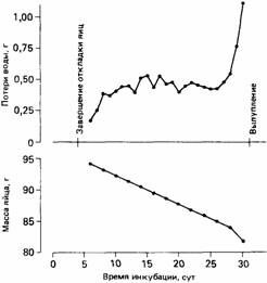 Рис.10. Потери воды яйцами серебристой чайки, измеренные по изменениям их массы. По мере потери воды воздушное пространство внутри яйца увеличивается, однако слишком большая потеря воды приводит к обезвоживанию зародыша.