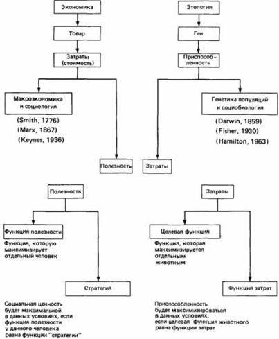 Рис.15. Параллель между понятиями экономики и этологии. Вверху. Общая схема, на которой указаны фамилии исследователей, внесших наибольший вклад в развитие этих областей науки, и даты публикации их основных работ. Внизу. Детализированная схема в приложении к отдельному человеку или животному.