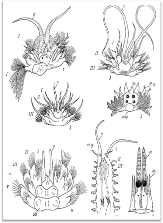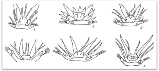 Рис.5 Основные типы головного отдела полиноид. 1 – лепидонотоидный, 2 – арктоноидный, 3 – хармотоидный, 4 – ифионоиднный, 5 – мацеллицефалоидный, 6 - адметеолоидный.