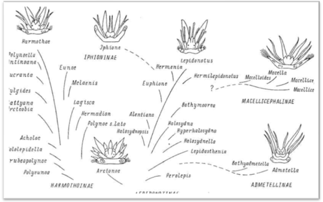 Можно наметить следующий общий ряд: роды с длинным телом, снабженным небольшими элитрами, а в соответствии с этим и со слабо развитыми нотоподиями, через промежуточные формы дали начало родам с коротким телом и небольшим количеством элитр, полностью прикрывающих спинную сторону червей. Элитры постепенно приобрели надежную защитную функцию, и черви смогли вести свободный хищнический образ жизни. Специализация у родов с коротким телом, как отмечалось в нашем общем морфологическом очерке, достигает наиболее высокого уровня.