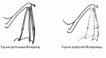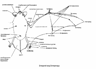 Тело рукокрылых сплющено дорзо-вентрально. Передние конечности их видоизменены в крылья: предплечье, пястные (метакарпальные) кости и фаланги пальцев (кроме первого, который свободен) чрезмерно удлиненны; между плечом, предплечьем, пальцами, боками тела и задними конечностями натянута тонкая эластичная летательная перепонка. Положение задних конечностей необычно: бёдра развёрнуты под прямым углом к телу и в одной плоскости с ним, глени направлены назад и в стороны. Ушные раковины относительно большие, хорошо развитые. У большинства видов имеется козелок – вертикально стоящий кожный вырост, отходящий от переднего края слухового отверстия. Хвост у большинства видов длинный, полностью или частично заключённый в межрёберную перепонку; свободный край этой перепонки поддерживается парной хрящевой или костной шпорой, отходящих от пятки. Вдоль основания шпоры у многих видов тянется кожистая своеобразная лопасть – эпиблема. Приведён пример внешнего вида Вечерницы.