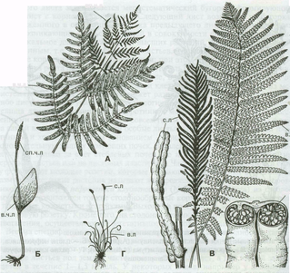 Рис. 2 - Спороносные листья папоротников: А - осмунды (Оsmunda); Б - ужовника(Оphioglossum); В - страусника (Маtteuccia); Г - трихоманеса (Тrichomanes); Д - схизеи (Schizaeae); в. ч. л - вегетативная часть листа; сп. ч. л - спороносная часть листа; в. л - вегетативный лист; с.л - спороносный лист