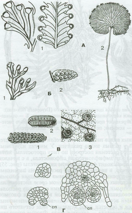 Рис. 3 - Типы размещения спорангиев и сорусов: А - расположение одиночных спорангиев: 1 - верхушечное по отношению к долям листа у даваллиевых (Davalliacеае); 2 - краевое у трихоманеса (Тrichomanes); Б - расположение сорусов: 1 - краевое у гименофилла (Нуmophillum); 2 - на нижней стороне листа у кочедыжника ломкого (Суstopteris fragilis); В - синангии у мараттиевых (Магаttiacеае): 1 - Аngiopteris; 2 - Магattiа; 3 - Сhristensiа; Г -перемещение спорангиев на нижнюю поверхность листа в ходе морфогенеза у схизеи (Schizaea); сп -спорангий