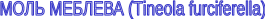 МОЛЬ МЕБЛЕВА (Tіneola furcіferella) Це невеликий метелик (розмах крил- 1 -1,5 див) з жовтуватими або темно-жовтими передніми крилами і жовтувато-сірі задніми; обидві пари крил блискучі, з помітним золотавим відтінком. Самка відкладає яйця протягом двох тижнів і за цей час може відкласти до 300 яєць. Розвиток проходить швидко: цикл одного покоління продовжується від 2 до 4 місяців. За рік змінюється до 4 поколінь, і тому літаючих метеликів можна бачити майже цілий рік. Гусениці линяють 6-8 разів. Вони плетуть шовкові трубчасті ходи, вплітаючи в них залишки їжі й екскременти. Окукливание відбувається наприкінці ходу в пухкому коконі. Лялечка розвивається від 7 до 18 днів.