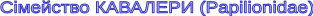 Сімейство КАВАЛЕРИ (Papіlіonіdae) або вітрильники. Це типові булавоусые, або денні, метелика. Від інших представників цієї групи чешуекрылых їх легко відрізнити за дуже характерною ознакою: внутрішній край задніх крил вирізаний і не прилягає до черевця. Крім того, у переважної більшості видів задні крила витягнуті в довгі "хвостики", що додає особливу изящность загальному контурові крил; передні ноги розвиті нормально. Сімейство містить у собі близько 20 пологів і 500 видів, розповсюджених майже по усьому світлу. Найбільша розмаїтість форм, до того ж найбільш великих і яскравих, зустрічається в тропічних країнах. Одні з найкрасивіших видів багато представлені в Індо-Малайській області й в Океанії. Славляться своєю красою і південноамериканськими кавалерами, що відрізняються великою розмаїтістю фарбувань. Тут можна зустріти саме різне розцвічення крил - від яскраво-жовтогарячої в сполученні з чорною і жовтим (Papіlіo zagreus) до оксамитово-чорної з червоною і білою плямами (Eurytіdes lysіthous). Особливе місце в сімействі займає рід дійсних кавалерів (Papіlіo): на його частку приходиться близько 40% від загального числа видів. З них 4 види зустрічаються в Росії