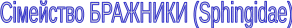 Сімейство БРАЖНИКИ (Sphіngіdae) Здебільшого великі метелики з товстим тулубом, звичайно звуженим до заднього кінця, і характерними товстими вусиками веретеновидной форми. Передні крила вузьким і довгі, найчастіше з рівним краєм; у зубчаток (Smerіnthus) їхній зовнішній край хвилястий і навіть зазубрений. Задні крила короткі. В даний час відомо понад 1200 видів цього сімейства, що особливо багато представлене в Америці. На території колишнього СРСР поширено близько 50 видів. Багато хто з них мають своєрідне фарбування крил, що сполучить у собі елементи захисного і демонстраційного фарбування. Досягається це в такий спосіб. Верхня сторона передніх крил у цьому випадку пофарбована в тьмяні, сіруваті або коричнюваті тони з неясним малюнком, що розчленовує поверхню, у виді темних, часто зиґзаґоподібних смуг. Задні ж крила мають зверху яскраве фарбування. Більшість бражників літає в сумерках, деякі з них літають удень, Великі 16-ногие гусениці бражників дуже своєрідні, завдяки тому що на задньому кінці в них мається щільний виріст у виді рогу. Пофарбовано вони в зелені або сірі тони, часто з косими смугами, спрямованими позаду наперед. Дуже красива гусениця олеандрового бражника, що досягає в довжину 10 див: вона зеленого кольору, з білою бічною смугою і білими крапками, з боків третього грудного кільця два великих білих вічка з чорно-синьою облямівкою. Своєрідні загрозливі пози гусениць бражників, що вони приймають при наближенні ворогів. Гусениці бражників живуть як на трав'янистої, так і на деревній рослинності. Дуже часто російська назва виду відповідає назві кормової рослини. Так, дійсно, олеандровий бражник розвивається на олеандрі, сосновий - на сосні і рідше на ялині, молочайный - на молочаї, жимолостева шмелевидка - на жимолості і т.д. Перезимовують бражники у фазі лялечки в землі або в рослинному покриві. Лялечка бражників відрізняється тим, що на задньої кінці в неї мається узвишшя у виді рогу, якого позбавлені тільки деякі види.