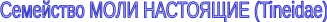 Семейство МОЛИ НАСТОЯЩИЕ (Tineidae) К семейству относятся мелкие, часто невзрачные бабочки, о внешности которых дают представление широко известные виды этого семейства, часто поселяющиеся в домах и причиняющие много неприятностей человеку. У настоящих молей обычно сильно развиты челюстные щупики, в то время как хоботок может быть недоразвит. Передние крылья длинные и узкие, на задних имеется широкая бахромка из волосков. Гусеницы живут в переносных чехликах. Семейство представлено огромным числом родов и видов, распространенных по всему земному шару. Многие виды настоящих молей связаны в своей жизни с лесом, где они обитают на стволах деревьев, пнях, трутовых грибах, в подстилке птичьих гнезд и т. д. Кроме растительноядных форм, среди настоящих молей есть большое количество видов, питающихся различными продуктами животного происхождения, такими как волос, мех, шерсть, перо, кожа, рог, кости, сухое мясо и др. Характерной особенностью их является способность переваривать кератин и другие труднорастворимые органические вещества. Среди таких молей - кератофагов выделяется группа видов космополитов, развезенных человеком по всему свету.