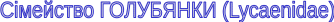 Сімейство ГОЛУБЯНКИ (Lycaenіdae) Так називають невеликих булавоусых метеликів, що рідко перевищують у розмаху 2,5-3,5 див, із трохи укороченими передніми ногами, але без щіточки на гомілках. Це одні з найпоширеніших денних метеликів, яких завжди можна зустріти на лугах, полях, лісових галявинах і просто на дорозі. У Європейській частині Росії вони представлені більш ніж 60 видами. Центральне місце серед них займає рід голубянок (Lycaena); у них верхня сторона крил пофарбована в блакитний, синій або чорно-бурий колір; нижня сторона найчастіше сіра або білувата з дрібними глазчатыми плямами. Гусениці голубянок знизу плоскі, із сильно опуклою спиною, покриті тонкими, короткими волосками; за своєю формою нагадують мокриць. Живуть на бобових рослинах. Лялечки підперезані.