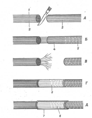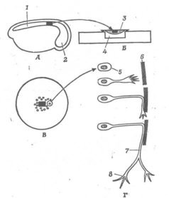 B. Вилучений досить велика ділянка нерва, і волокна, що регенерують, відділені проміжком від частини нерва, що дегенерує. Волокна ростуть у всіх напрямках. Г. У проміжок між кінцями перерізаного нерва поміщають ділянка ліофілізованого нерва, і нервові волокна, що регенерують, ростуть уздовж цього мертвого нерва. Д. Два кінці перерізаного нерва з'єднані трубкою, у якій утримується плазма крові. 1 - нерв; 2 - нервове волокно; 3 - нерв, що дегенерує; 4 - нервове волокно, що регенерує; 5 - слід, залишений волокном, що дегенерувало; 6 - ліофілізований нерв; 7 - трубка; 8 - плазма крові.