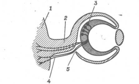 Нейробласти, що дають початок зоровому нервові, знаходяться у внутрішньому шарі очного келиха. Конус росту нейробласта переміщається уздовж внутрішньої поверхні очного келиха до отвору - очної щілини, а потім по черевній стороні очної стеблинки назад до головного мозку. 1 - мозок; 2 - очна стеблинка; 3 - нейробласт; 4 - нервове волокно; 5 - очна щілина.