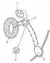 Нейробласти зображені у виді маленьких кружків. Пунктирна стрілка вказує шлях міграції нейробластів від нервового гребеня в область утворення спинальних і симпатичних гангліїв. Стрілки, що з'єднують спинальний ганглій зі спинним мозком, позначають шлях нервових волокон, що розвиваються, а стрілки від спинального ганглія до кінцівки показують шлях нервів кінцівки. 1 - нейробласти нервового гребеня; 2 - нейробласти спинального ганглію; 3 - нейробласти спинного мозку; 4 - симпатичні нейробласти; 5 - кінцівка, що розвивається.