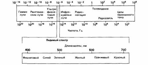 Рис. 8. Длина волн электромагнитного спектра в метрах; видимая часть спектра в увеличенном масштабе.