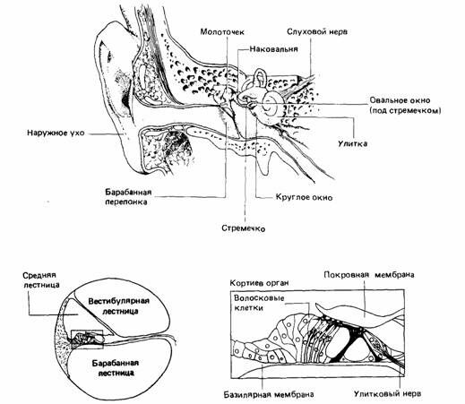 Внутреннее ухо представляет собой лабиринт взаимосвязанных наполненных жидкостью камер и каналов. Оно состоит из двух различных частей: вестибулярного аппарата, который ведает чувством равновесия, и улитки - спирально свернутой трубки, которая служит органом слуха. Внутри улитки проходят три канала: вестибулярная лестница, берущая начало у овального окна; барабанная лестница, которая начинается у круглого окна и другим своим концом соединяется с вестибулярной, и средняя лестница, расположенная между первыми двумя. Среднюю и барабанную лестницы разделяет основная мембрана, на которой находится кортиев орган. Этот орган образован рядами рецепторных клеток с сенсорными волосками на апикальных концах. Волоски упираются в студенистую покровную мембрану. Дендриты сенсорных нейронов заканчиваются на поверхности волосковых клеток, и когда колебания основной мембраны заставляют эти клетки колебаться, деформация волосков вызывает генераторные потенциалы, которые возбуждают сенсорные нервы.