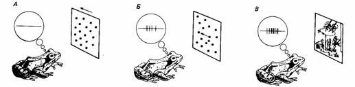 Когда стимул обнаружен, он может быть автоматически классифицирован таким образом, что все его посторонние особенности отфильтровываются. Так, например, Летвин и др. показали, что у лягушки фоторецепторы сетчатки соединены между собой, образуя рецептивное поле, как показано на рис. 20. Некоторые из них, называемые «детекторами жуков», различают главным образом мелкие темные движущиеся предметы. В поисках пищи лягушки реагируют на такие объекты больше, чем на другие стимулы.