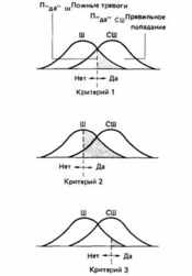 Рис. 18. Гипотетические эффекты разных критериев решения согласно теории обнаружения сигнала. Вероятность ответов «да» соответствует области справа от критерия, а вероятность ложных тревог темным областям. Предполагается, что стимул и шум остаются поименными.
