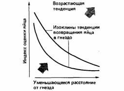 Рис. 25. Пространство признаков для возвращения яйца в гнездо. Гиперболическая форма изоклин показывает, что индекс оценки яйца мультипликативно сочетается с расстоянием яйца от гнезда.